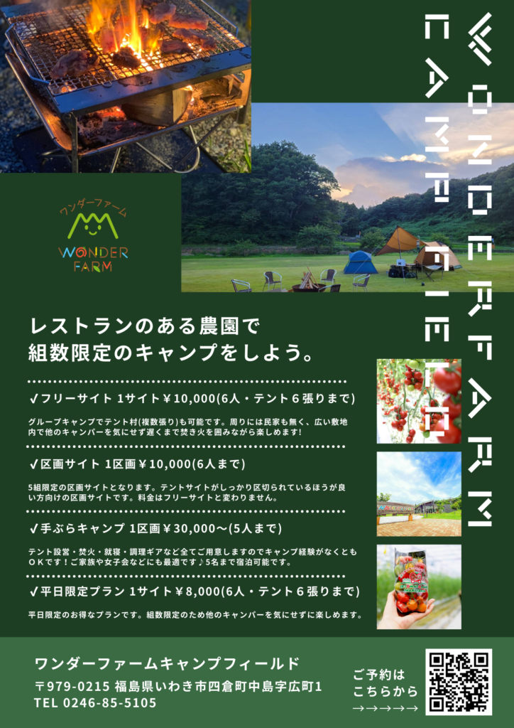 | 注意事項 | ・4日前までの事前要予約 ・席のご指定は出来かねますので予めご了承下さい。 ・アレルギー・苦手食材はご要望欄にご記入下さい。 ・※20名様以上のBBQのご利用はレストランクロスワンダーダイニングまでお電話でお問合せ下さい。(TEL 0246-38-8853) ・ご予約時間から30分を過ぎご連絡が取れない場合、やむを得ずキャンセル扱いとさせて頂きますので、遅れる場合は必ずご連絡をお願い申し上げます。 |